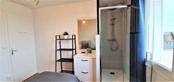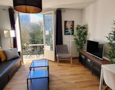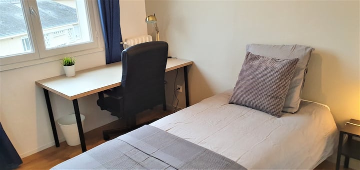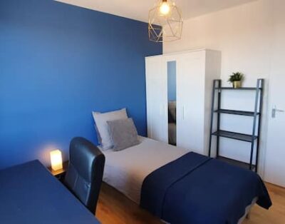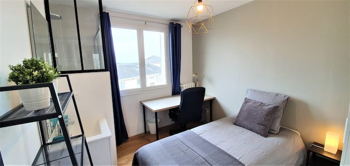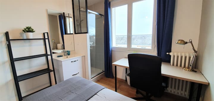A beautiful bedroom (locked) with a private shower, ready to live in a large apartment – Less than 350m from the TGV station of Saint-Laud – Ideal for an employee on the go or a student. Namely: the apartment has 4 bedrooms with a common fully equipped kitchen, a large living room of 22m2 with a large balcony. If necessary, you can park your bike in the building’s premises. Facilities: Extra high-speed Orange WiFi & Access to 140 TV channels.